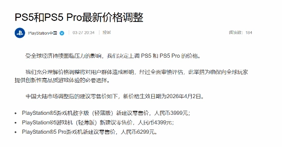 3月27日消息,在索尼全球范围内调整产品价格之后,PlayStation中国也发布正式公告称,由于全球经济持续承压,因此决定提高中国大陆市场PS5及PS5 Pro的建议零售价。