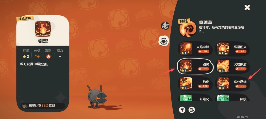 孵化出柴渣虫后,直接精灵喂养提升等级,技能选择引燃跟充分燃烧
