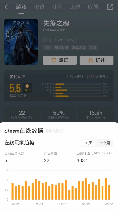 根据游民众评的数据,最近《失落之魂》在Steam平台上的每日平均在线人数大概只有20人上下,游戏社区的活跃度也非常低。