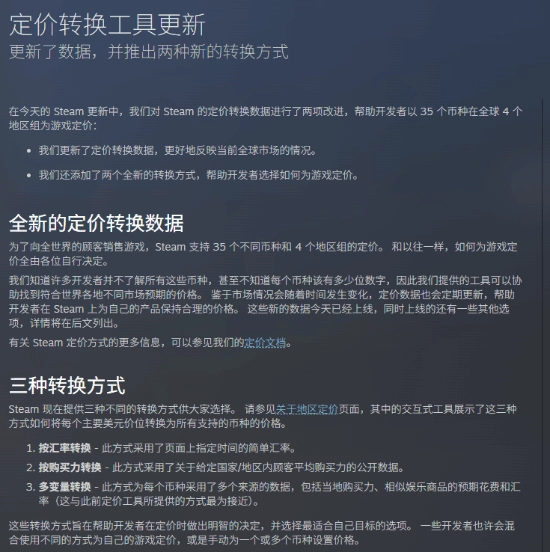 新增两种定价转换方式:为开发者提供更多选择,帮助他们根据目标市场的消费习惯和货币特征,灵活制定本地售价。Valve表示:“许多开发者并不熟悉所有这些货币,甚至不清楚每种货币应保留几位小数。我们提供的工具旨在帮助他们在全球各市场找到符合预期的定价。”